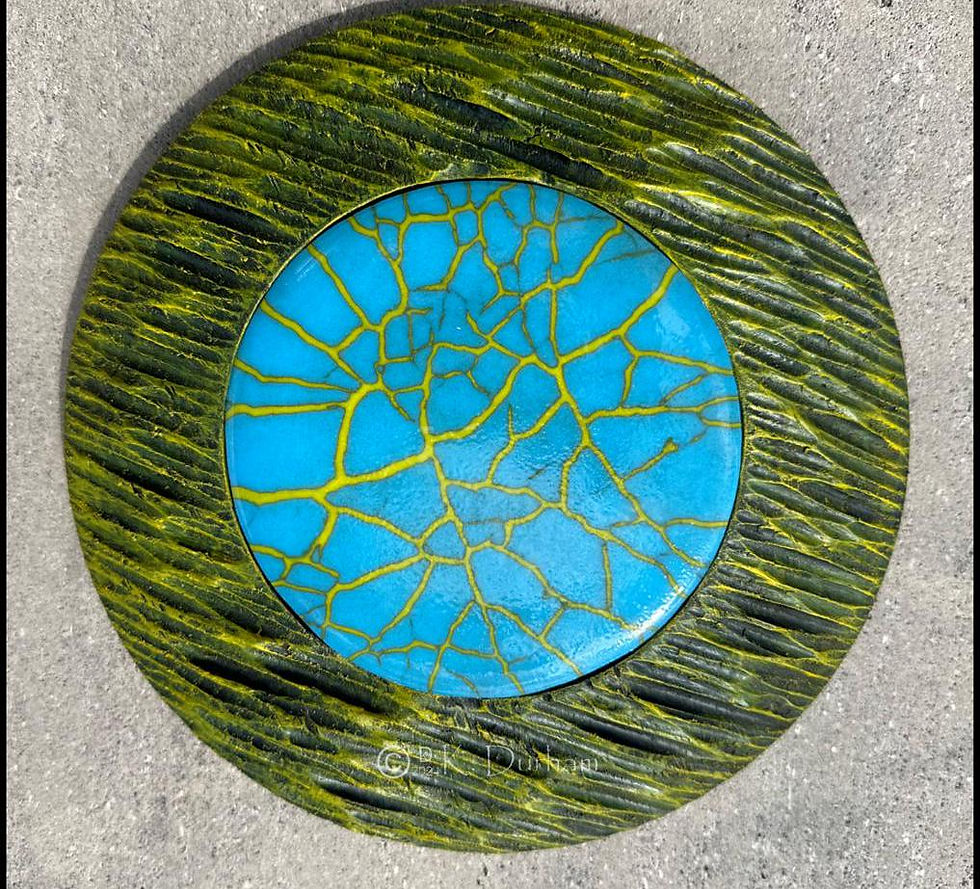 Large Blue & Yellow Crackle in Round Yellow Wood Frame